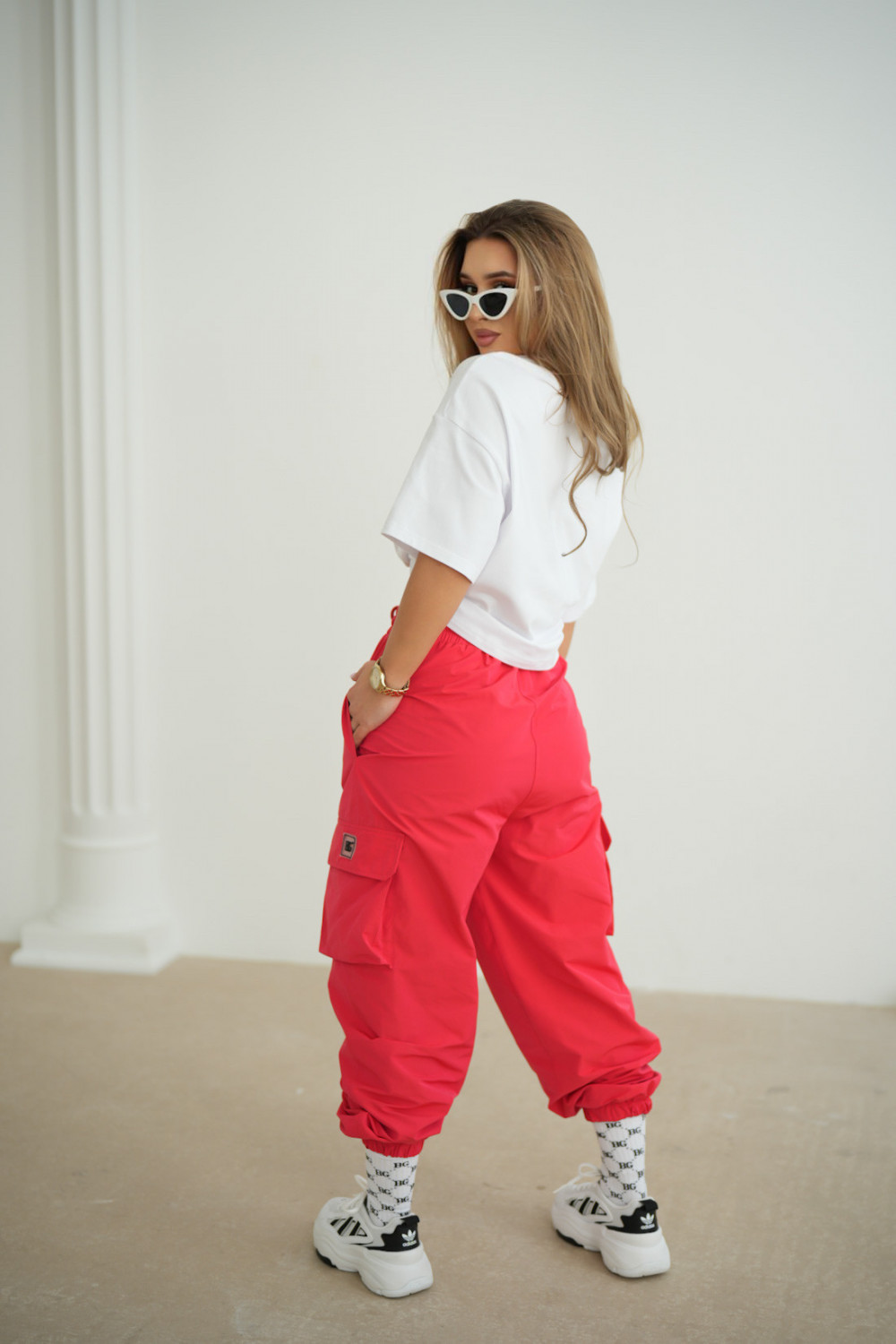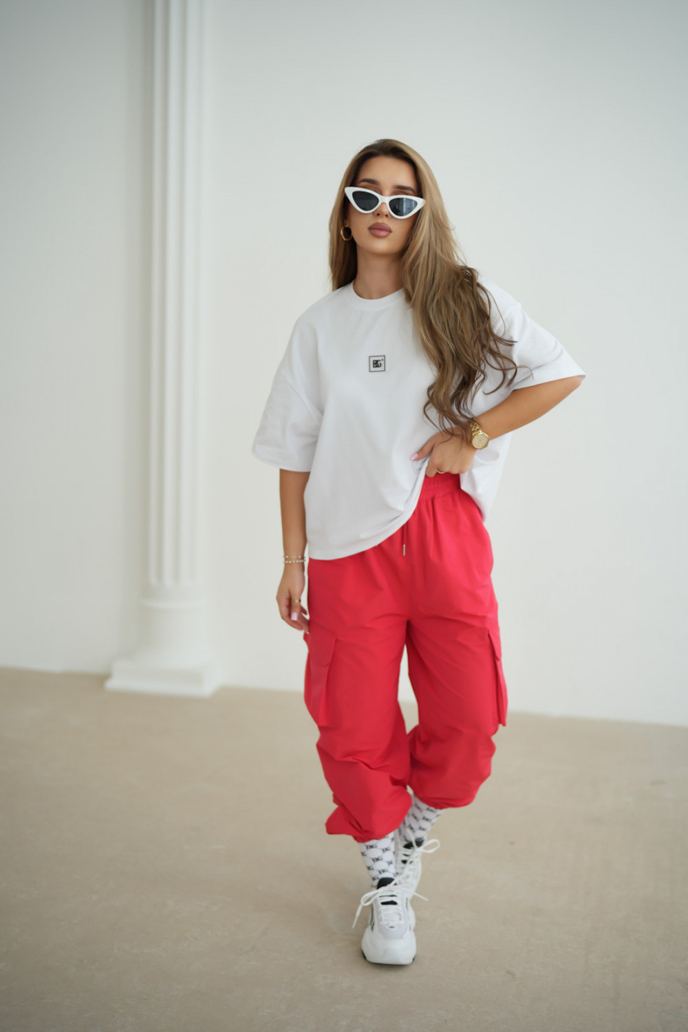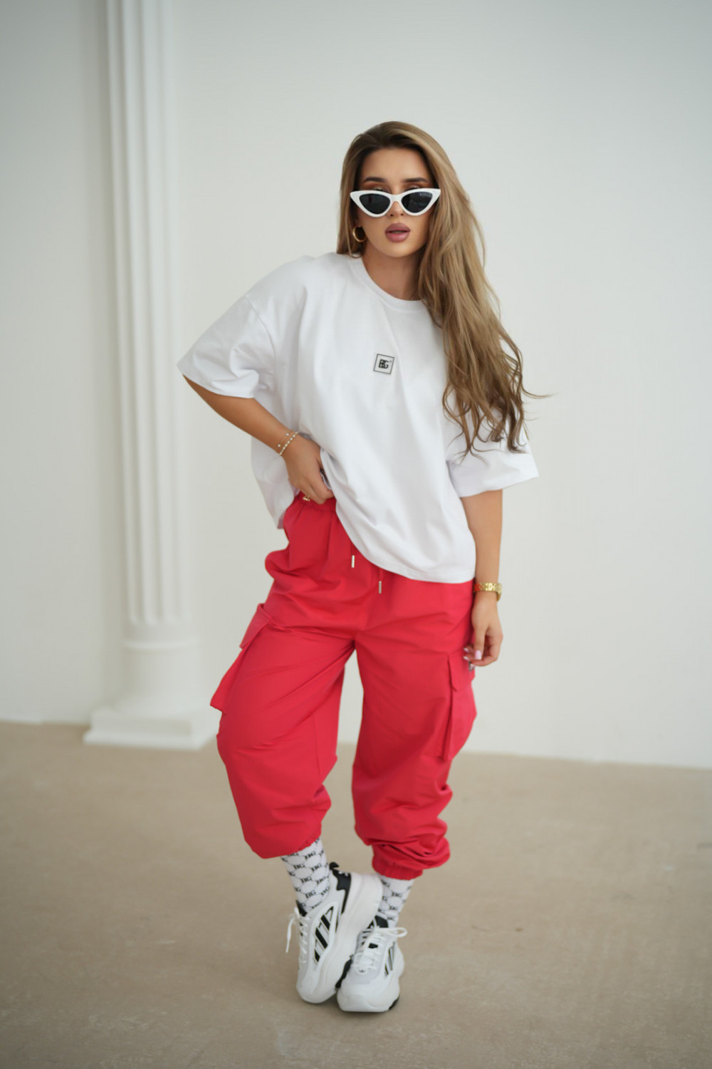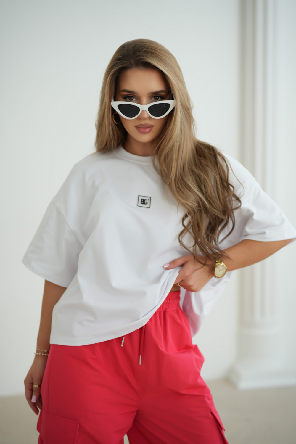 Bawełniany, klasyczny T-shirt o szerszym kroju. Żelowa naszywka logowana marką BG na środku. Modelka ma na sobie rozmiar S.