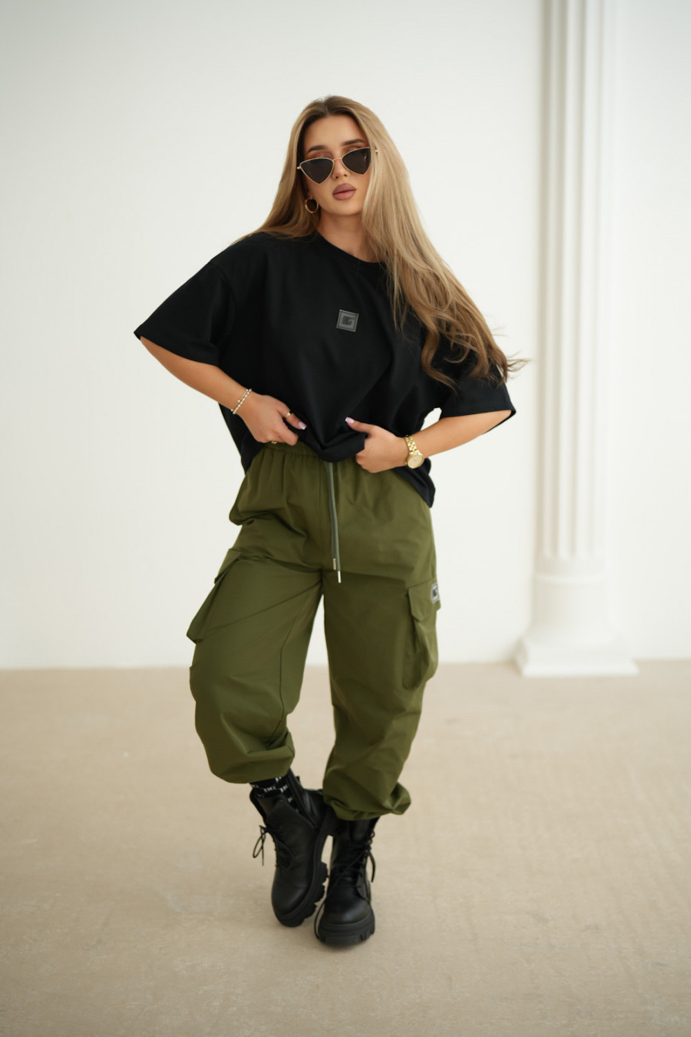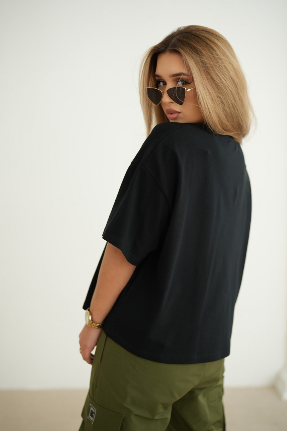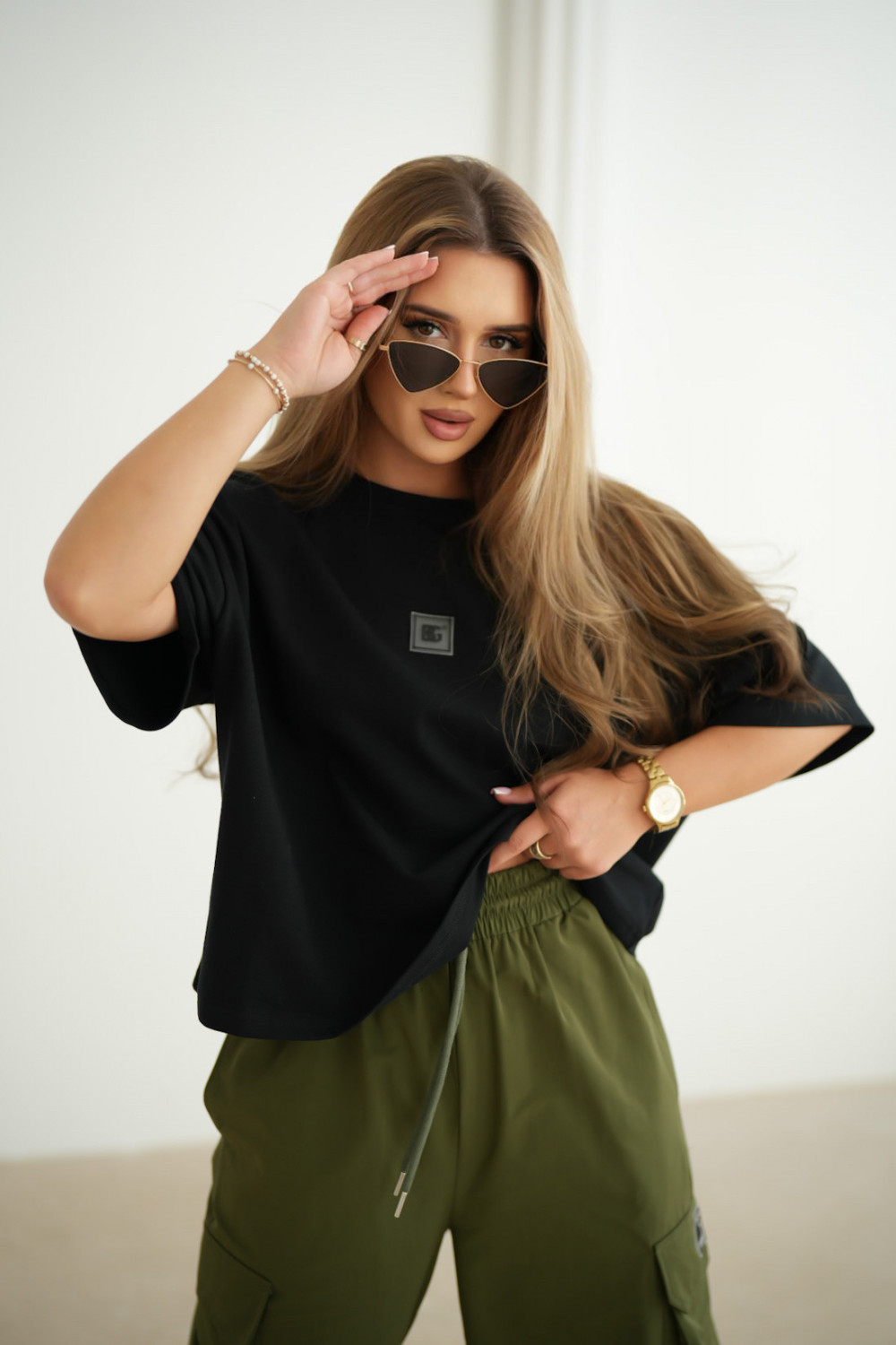 Bawełniany, klasyczny T-shirt o szerszym kroju. Żelowa naszywka logowana marką BG na środku. Modelka ma na sobie rozmiar S.