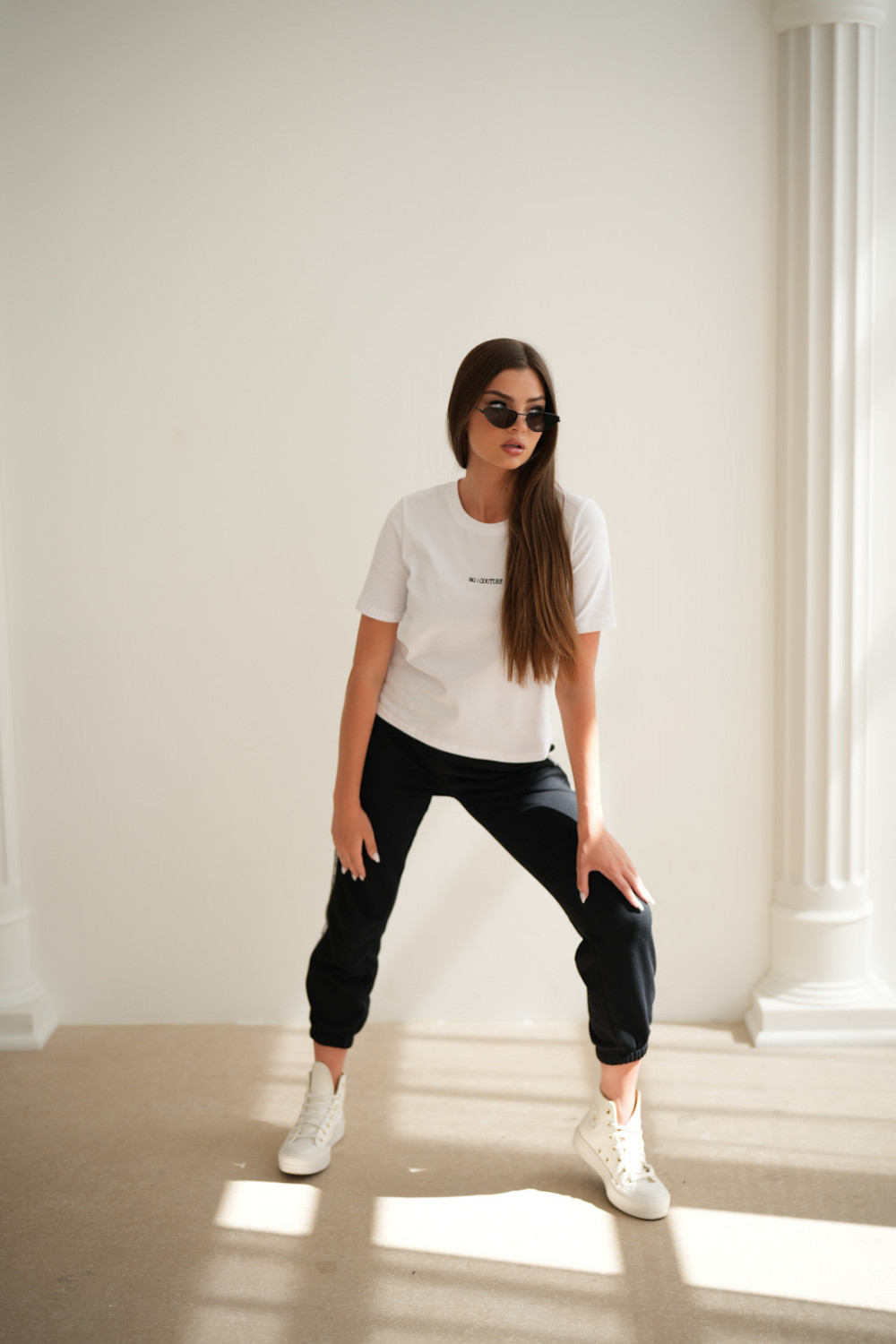Klasyczny T-shirt z wysokiej jakości bawełny. T-shirt posiada haftowane logo na środku. Modelka na zdjęciu posiada na sobie rozmiar S.