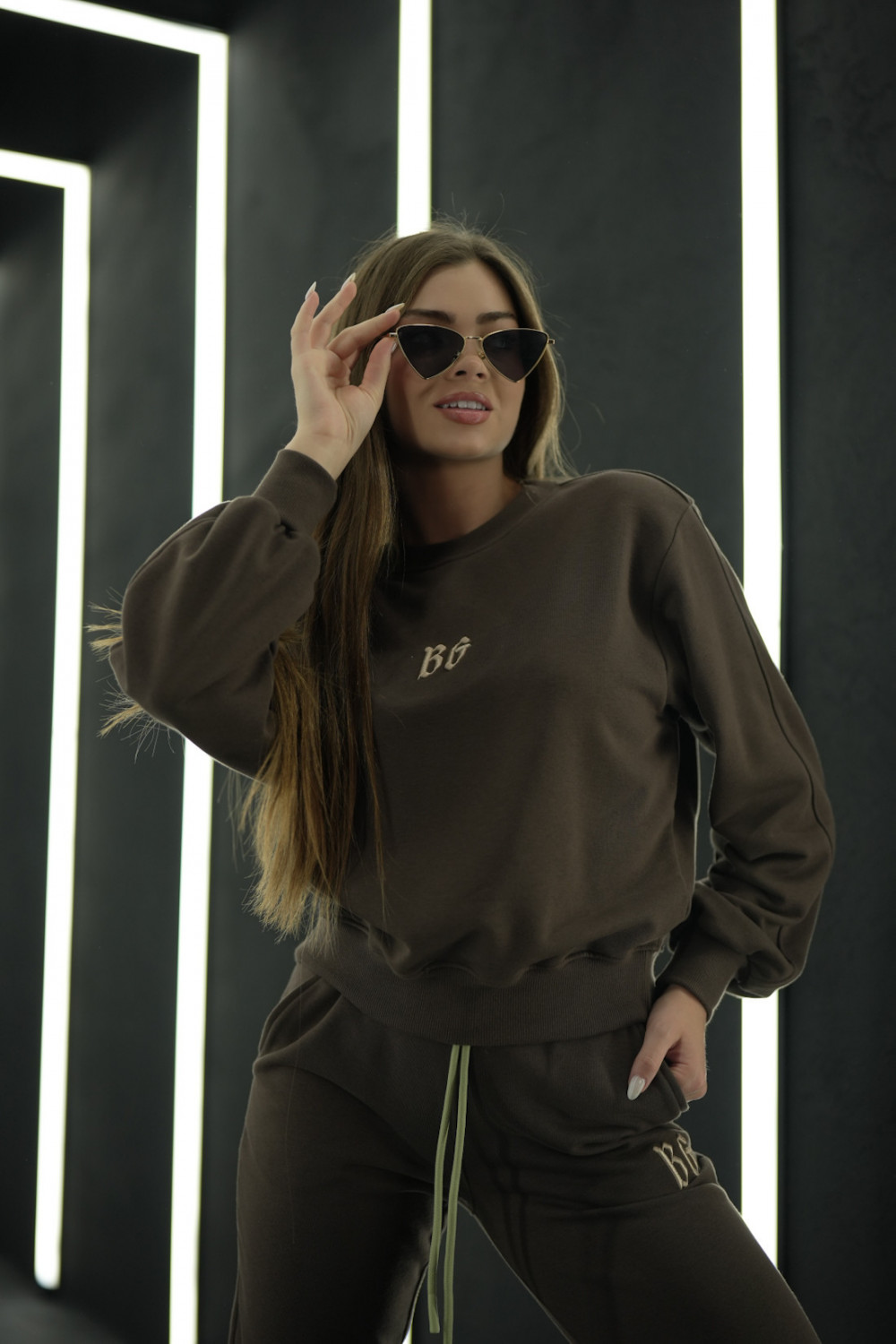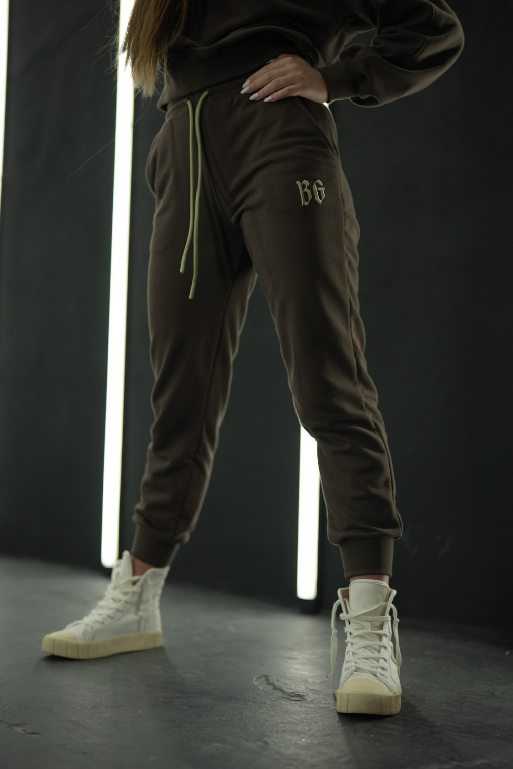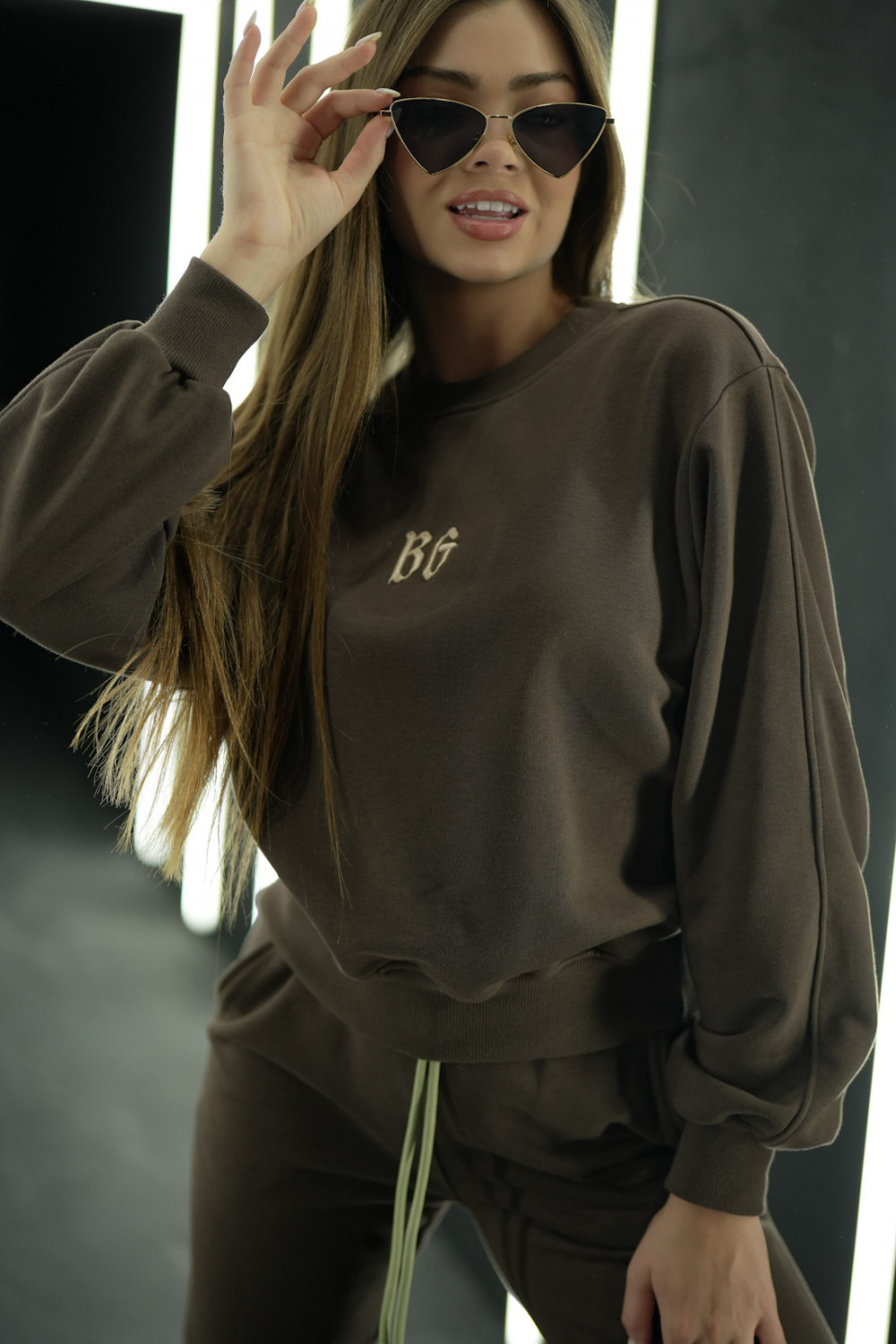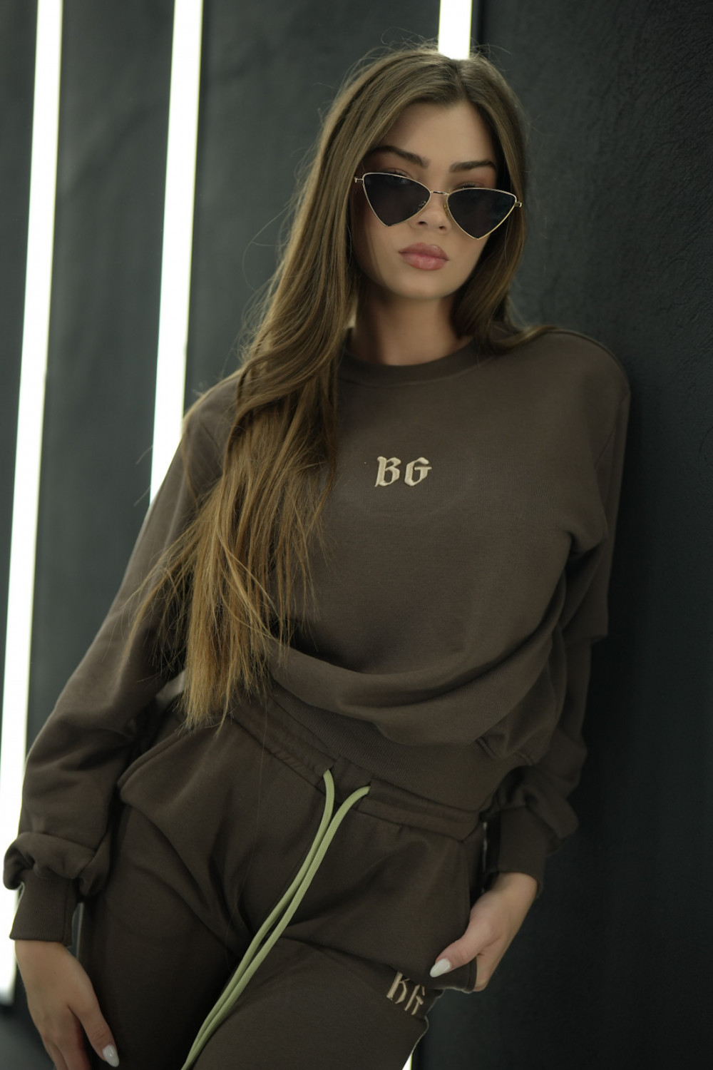 Komplet dresowy składający się z bluzy bez kaptura oraz spodni na gumce ze sznurkiem. Logowanie marką BG w stylu gotyckim na środku bluzy oraz na nogawce spodni. Modelka ma na sobie rozmiar S