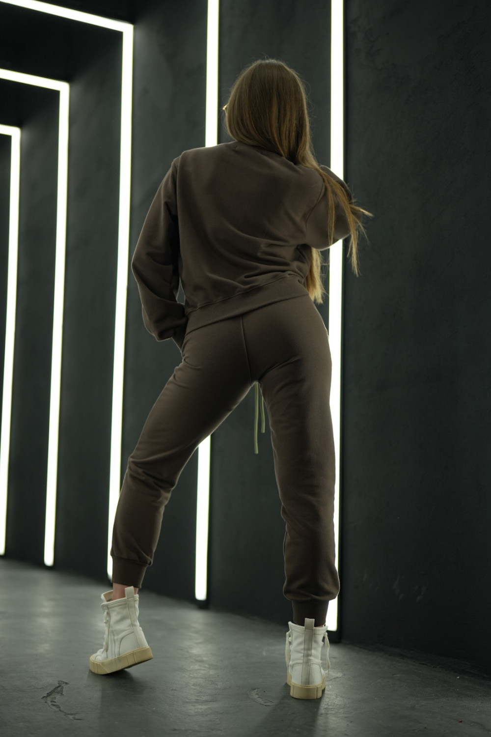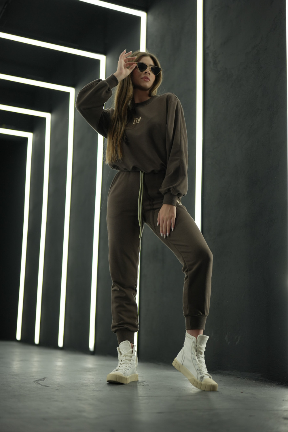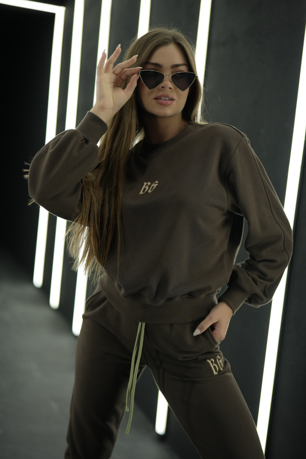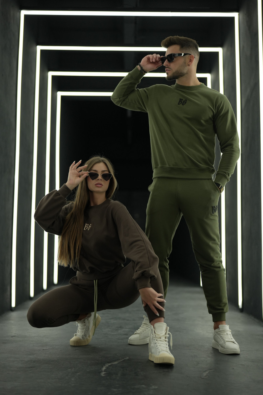 Komplet dresowy składający się z bluzy bez kaptura oraz spodni na gumce ze sznurkiem. Logowanie marką BG w stylu gotyckim na środku bluzy oraz na nogawce spodni. Modelka ma na sobie rozmiar S