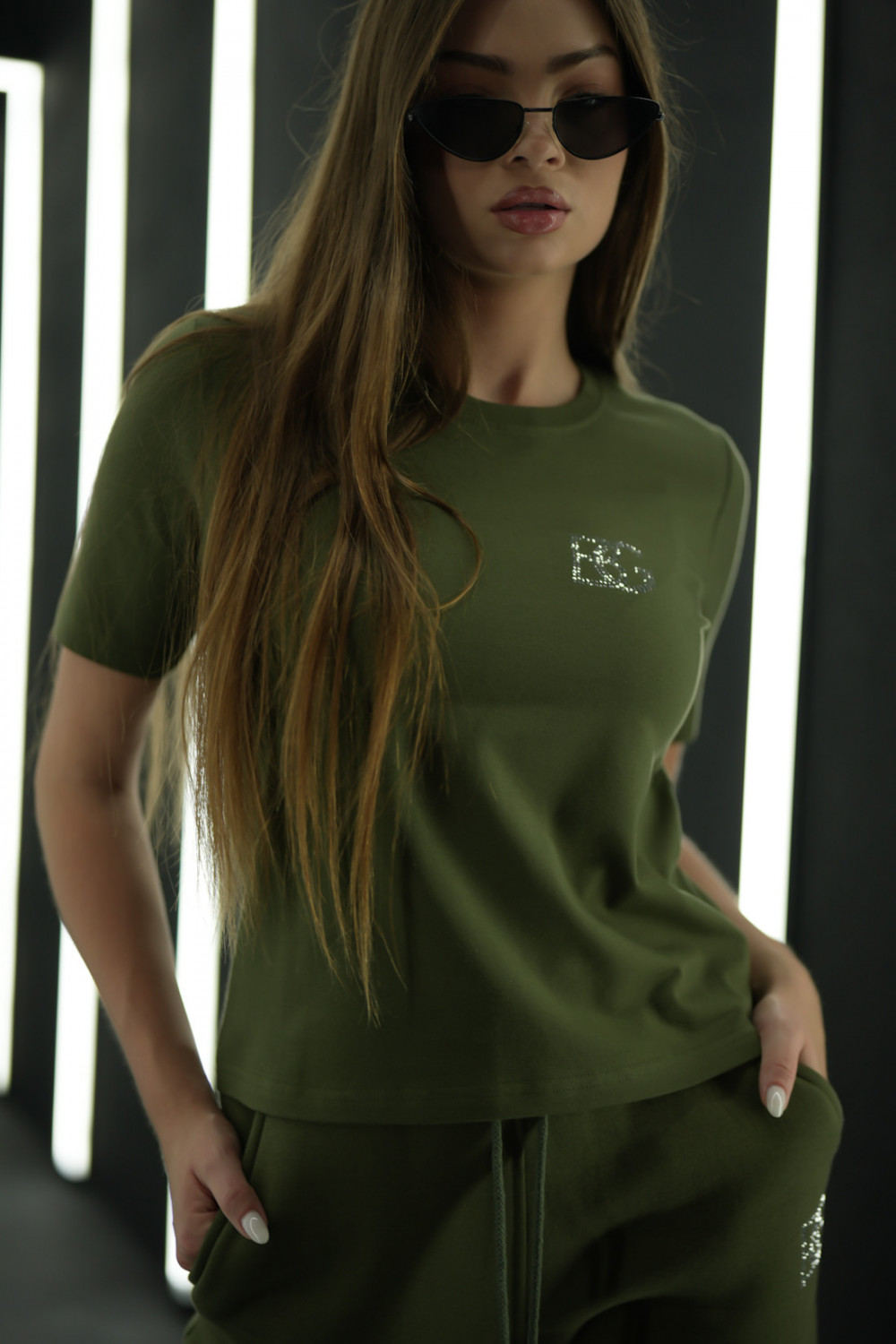 T-shirt bawełniany z charakterystycznym logo marki BG z wyklejanych srebrnych cyrkonii. Modelka na zdjęciu ma na sobie rozmiar S.